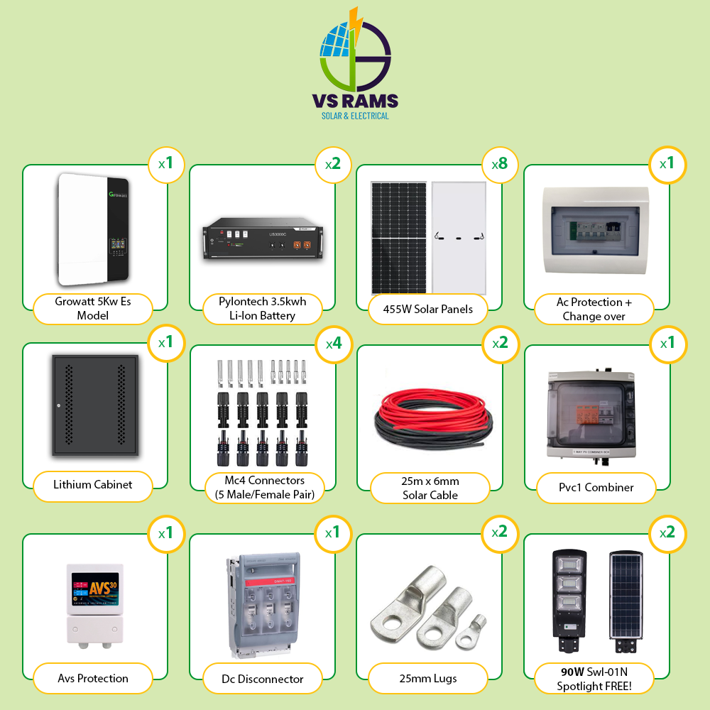- 1 x Growatt 5kw Hybrid Inverter.